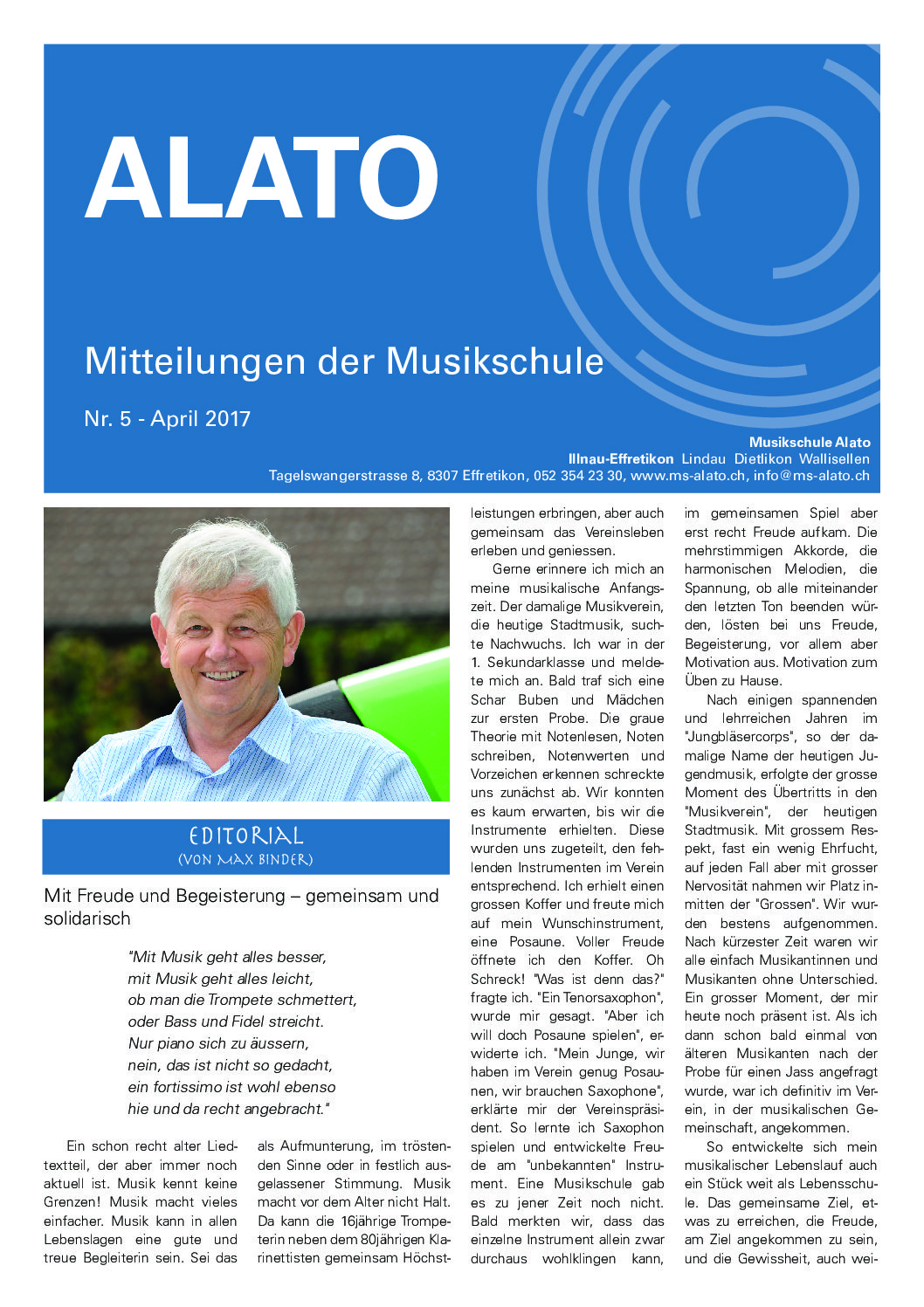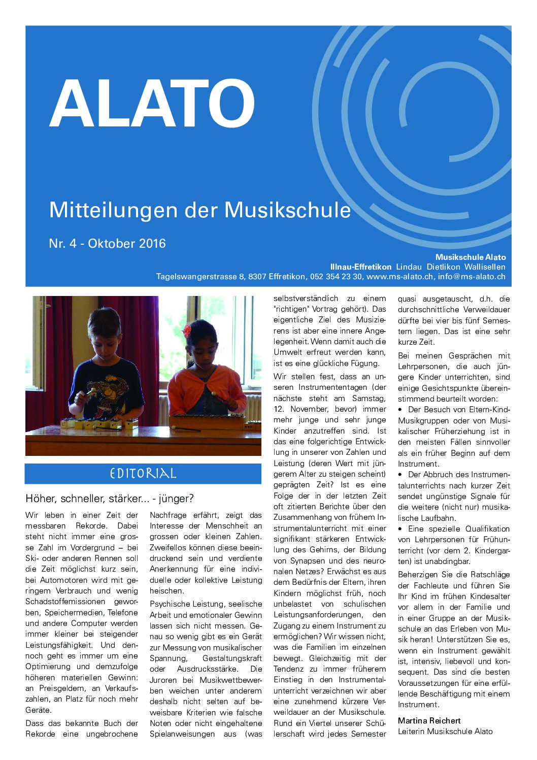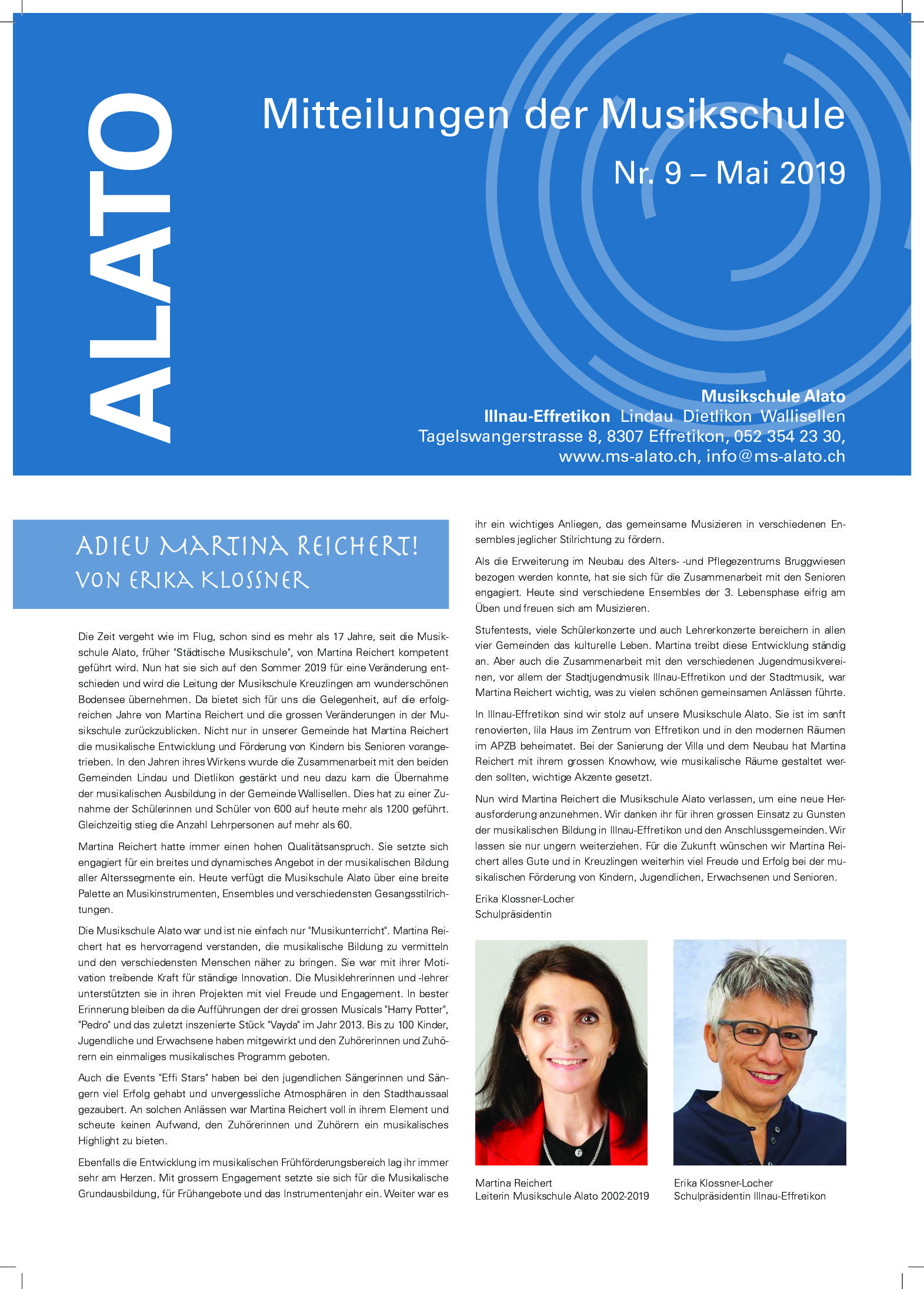 Etwa halbjährlich werden Mitteilungen aus der Musikschule an unsere Schülerinnen und Schüler verschickt, und die Volksschüler der Gemeinden Effretikon, Lindau, Dietlikon und Wallisellen erhalten unser “ALATO” über die Schulhauspost. Die pdf der Publikationen können Sie hier zum Lesen herunterladen. Gerne schicken wir Ihnen auch ein Exemplar der jeweils neuesten Ausgabe zu, eine Mail an info@ms-alato.ch genügt.
